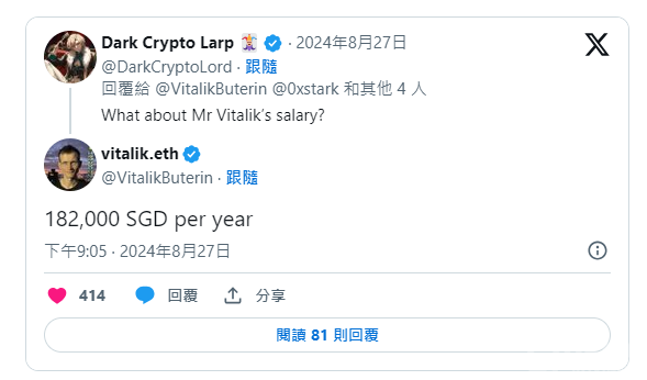 當(dāng)被網(wǎng)友 Dark Crypto Larp 問(wèn)及人們關(guān)心的薪水問(wèn)題時(shí),Vitalik Buterin 直言不諱地透露,他的年薪為 18.2 萬(wàn)新加坡元(約合98萬(wàn)人民幣)。