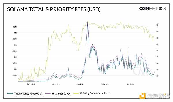 受整體市場和memecoin飆升的推動,Solana的總費用在3月份達到了450萬美元的峰值。此時,優(yōu)先費用占總費用的95%(自8月以來,這一數(shù)字一直保持在80%左右),代表著對交易納入的高需求。然而,活動已顯著減少,目前總費用為73.2萬美元,優(yōu)先費用為53.3萬美元。采用和使用特征