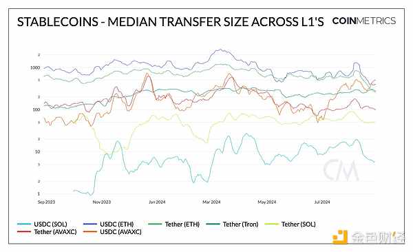 這一趨勢也反映在上圖中,該圖顯示了各主要穩(wěn)定幣(USDC和USDT)在第1層上的中位轉賬規(guī)模。Ethereum上的USDC和USDT通常都顯示出較高的中位轉賬規(guī)模——盡管最近分別降至400美元和267美元——這得益于Ethereum主網(wǎng)費用的降低。Tron上的Tether一直保持在270美元的典型規(guī)模,而Solana的穩(wěn)定幣轉賬價值最低(USDC為7美元)和(USDT為50美元)。