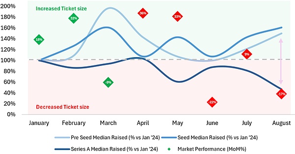 Web3本身并不是一個行業,而是一種正在改變全行業的技術堆棧。同時Web3中沒有任何兩個賽道是相同的。創始人的背景不同以及項目所提供的Blockchain解決方案不同。因此,Web3的各個賽道都對資本有不同的要求。為了讓大家更清楚各個賽道對資本的需求,我們將融資規模與各賽道融資階段相結合,時間區間為2024年初至8月11日,然后得到一個圖表: