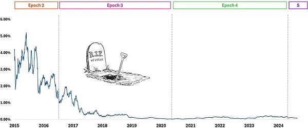 雖然減半可能會產生一些心理影響,提醒Holder注意他們滿是灰塵的Bitcoin錢包,但很明顯,其根本影響已經變得無關緊要。上一次有意義的減半影響發生在2016年。2020年,引發牛市上漲的不是減半,而是對COVID-19的應對措施以及隨后的印鈔。現在是時候讓試圖把握市場時機的創始人和投資者關注更重要的宏觀經濟驅動因素,而不是依賴四年周期了。考慮到這一點,我們將在未來的《Tokens趨勢線》中探討市場周期背后的真正宏觀驅動因素。