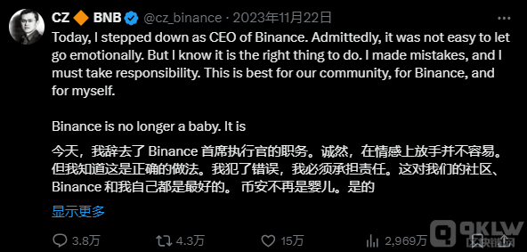 作為與美國司法部認罪協議的一部分,CZ在2023年11月底宣布辭去幣安首席執行官的職務。他在X平臺(原推特)發文,表達了卸任的復雜心情: