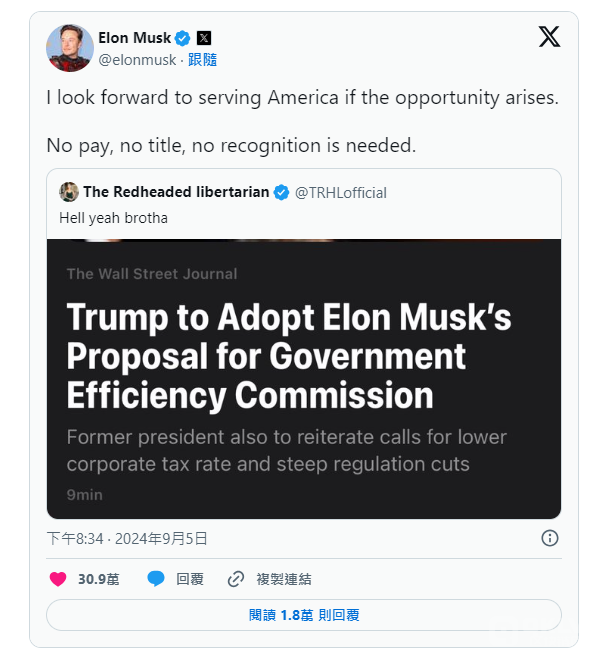 昨日,馬斯克在X平臺轉發了有關川普計劃成立政府效率委員會的新聞,明確表示他愿意接受這一職位。他強調,如果能為美國服務,他不求回報、頭銜或表彰,只是希望為提升政府運作效率貢獻一份力量。