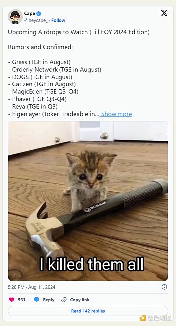 我們仍然在等待EIGENTGE,但是上市前的價格為3.62美元,大多數farmers的投入不會超過400美元,即使能額外獲取100EIGEN。我們可以看到Karak和Symbiotic在TGE上搶先EIGEN,但這些收益耕作是需要消耗大量資本的。