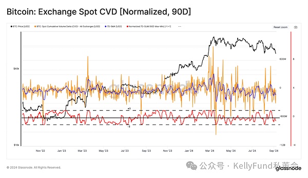 接下來,我們將研究交易所的現(xiàn)貨交易量。在這里,我們著重關(guān)注90日MinMax標(biāo)量,該標(biāo)量標(biāo)準(zhǔn)化研究特定時間段內(nèi),交易量極值的+1/-1標(biāo)準(zhǔn)差范圍內(nèi)的波動情況。