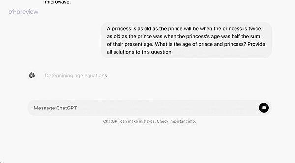 在一個官方演示中,o1-preview解答了一個非常困難的推理問題:當公主的年齡是王子的兩倍時,公主的年齡與王子一樣大,而公主的年齡是他們現在年齡總和的一半。王子和公主的年齡是多少?提供這個問題的所有解。