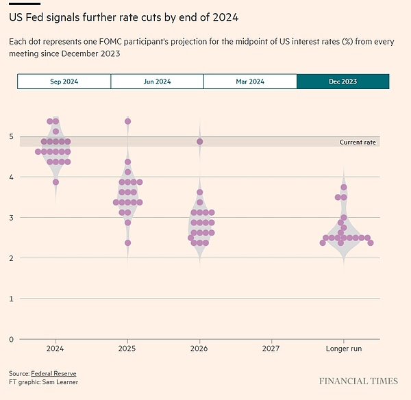 美聯(lián)儲官員們也明確表示他們不會止步于此,周三公布的所謂點陣圖預測顯示,聯(lián)邦公開市場委員會(FOMC)的大多數(shù)成員估計今年政策利率將再下降半個百分點,隨后在2025年進行一系列降息,將利率保持在3.25%至3.5%區(qū)間。