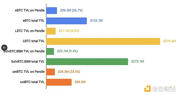 近期,Pendle已陸續將四種BTCLST集成到其積分市場中,包括$LBTC、$eBTC、$uniBTC和$SolvBTC.BBN。當前各LST在Pendle上的流動性和總TVL情況如圖所示。其中,$LBTC的實際采用情況高于LBTC(Corn)池中的表面數值。由于37%的$eBTC由$LBTC支持,Pendle對$eBTC的集成也會讓Lombard間接受益,從而使$LBTC持有者擁有更多優化收益策略的機會。