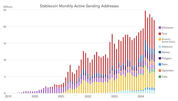 穩定幣是目前加密領域的“殺手級應用”。如今,市場上流通的穩定幣總值超過1600億美元,而在2020年,這一數值還僅為幾十億美元。每個月有超過2000萬個地址在公共Blockchain上進行穩定幣交易。僅在2024年上半年,穩定幣的結算金額就超過了2.6萬億美元。穩定幣相較于現有的支付系統具有顯著優勢:鏈上可編程性、強審計能力、交易即結算、資金自托管以及互操作性。