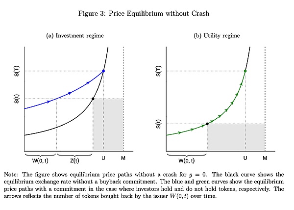 活動增長:假設(shè)交易平臺的活動以固定的增長率\(g 活動量:在沒有發(fā)生崩潰的情況下,平臺在時間\(t\)的活動量為 \(A(t)=e^{gt}\),否則\(A(t)\)接近于0。 此模型考慮了Tokens的效用需求和交易所為回購Tokens而投入的資源量如何與平臺活動成正比,進一步設(shè)定了交易所運行概率和違約強度,為理解交易所Tokens的市場動態(tài)提供了一個全面的分析框架。五、均衡分析 A.市場清算條件的圖形表示 在分析均衡結(jié)果之前,文章提供了市場清算條件的圖形表示。圖2展示了市場清算條件的機制,其中給定的X$(t)值由圖中的陰影矩形表示。向上傾斜的曲線代表了用戶向投資者和交易平臺提供Tokens的供給曲線。投資者和交易平臺持有的Tokens總量為W(0,t)+Z(t),用戶則持有剩余部分,即MW(0,t)Z(t)。用戶保持的美元余額為X$(t)。如果匯率上升,用戶愿意提供更多的Tokens,因為他們需要較少的Tokens來維持相同的美元余額X$(t)。這導(dǎo)致了匯率與投資用途Tokens數(shù)量之間關(guān)系的向上曲線。 B.有無投資者的均衡匯率 均衡匯率水平取決于平臺的回購承諾是否足夠大,能夠吸引投資者持有Tokens。要讓投資者持有Tokens,所需的回購資源隨著投資者預(yù)期回報的增加、平臺的失敗率上升而增加,隨著平臺增長率的增加而減少。 圖(a)顯示了當(dāng)投資者選擇持有Tokens時,回購計劃下的均衡路徑;圖(b)則顯示了當(dāng)投資者不持有Tokens,平臺僅從用戶手中回購時的均衡路徑。在g=0(平臺無增長)的情況下,黑色曲線未發(fā)生變化,匯率的變化完全由回購驅(qū)動。 推論1 在完全回購計劃中,如果Y$>(r+λg)X$,那么初始均衡匯率為 S(0)=1/M*Y$/(r+λg)。否則,初始均衡匯率為S(0)=X$/M。如果投資者持有Tokens,匯率的變化類似于戈登增長模型下持續(xù)增長的現(xiàn)金流估值。如果投資者不持有Tokens,初始匯率僅反映用戶需求與Tokens數(shù)量的比例。 六、平臺的回購計劃成本 A.資本成本與所需回報率之間的差距 本文利用模型評估交易所通過回購承諾籌集的額外資金與回購計劃預(yù)期成本之間的差異。交易所通過出售帶有回購承諾的Tokens獲得的資金,等于Tokens總量乘以均衡匯率。若沒有回購承諾,交易所出售Tokens的收入為X$,因此回購承諾帶來的增量收入為差額。C表示回購計劃整個期間的預(yù)期成本,這可以通過計算出整個計劃的折現(xiàn)成本來得出。 命題2 通過提供回購承諾,交易所能夠籌集的額外資金少于其預(yù)期的折現(xiàn)成本。 該命題表明,通過回購承諾籌集的資金成本高于投資者要求的回報率。因此,若交易所能夠通過更高效的資本市場以較低成本籌資,則應(yīng)避免回購承諾。 B.價格操縱下的額外成本 通過回購承諾發(fā)行Tokens可能導(dǎo)致更高的成本,尤其是可能被大投資者通過“銷毀”Tokens(即永久凍結(jié)Tokens)來操縱價格。此時,平臺可能被迫無限期回購,推高Tokens價格。 1. 單一大投資者 命題3 如果一個大投資者持有用戶未持有的所有Tokens,則投資者可以銷毀部分Tokens,前提是某些條件成立。這使得Tokens價格上漲,回購速度放緩,最終導(dǎo)致平臺無法完成回購計劃,價格持續(xù)上漲。 2. 一個大投資者,多個小投資者 命題4 若最大投資者持有的Tokens比例達到一定水平,則銷毀部分Tokens對其有利。在這種情況下,即使有其他小投資者加入銷毀行動,最大的投資者仍能從中獲利。 3. 許多小投資者 當(dāng)沒有單個投資者持有足夠的Tokens來進行操縱時,多個投資者可以通過合作銷毀Tokens獲利。這種合作通過Blockchain上的多重輸入交易可以實現(xiàn),盡管在實際操作中協(xié)調(diào)多個投資者可能較為復(fù)雜。 4. 防止操縱 平臺可以通過限制回購承諾的Tokens數(shù)量來防止操縱。如果平臺承諾回購的Tokens數(shù)量超過Tokens總量的一半,則容易受到操縱。因此,許多平臺通常會限制回購承諾的比例在50%以內(nèi)。七、具有投資動機的用戶 在本節(jié)中,討論了用戶對Tokens的需求受其價格升值率影響的情形,尤其是在回購計劃是全額回購時的情況。即便平臺只承諾少量資源用于回購,只要用戶有投資動機,回購承諾仍然會對Tokens價格產(chǎn)生影響,從而影響平臺通過Tokens銷售籌集的資金量。 命題5 當(dāng)用戶的需求取決于Tokens升值率時,回購承諾的資源越多,用戶需求和平臺通過Tokens銷售籌集的資金也會越多。 例如,如果用戶的效用函數(shù)是對數(shù)函數(shù),回購承諾的資源越多,初始均衡匯率就會越高。 八、結(jié)論 本文得出,回購承諾對加密交易所Tokens的價格動態(tài)有顯著影響,并且在某些情況下可能導(dǎo)致劇烈的價格波動。回購承諾是一種成本高昂的籌資方式,可能會被大投資者或多個小投資者利用。因此,回購承諾的存在通常表明平臺在傳統(tǒng)資本市場中面臨融資障礙。