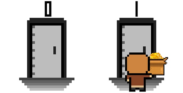 你手里捧著小飯盒,面前有兩扇門,左邊寫著0,右邊寫著1。