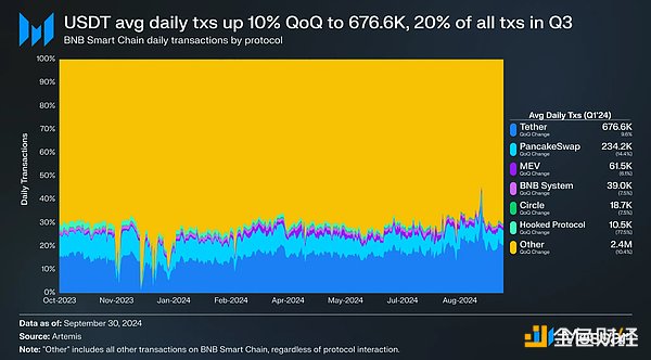 除USDT外,前六大協(xié)議中沒有其他協(xié)議在交易量上實(shí)現(xiàn)環(huán)比增長。然而,MEV(環(huán)比增長2%至2%)、BNBSystem(環(huán)比增長1%至1%)和Circle的USDC(環(huán)比增長1%至0.5%)在交易份額上都有所增加。