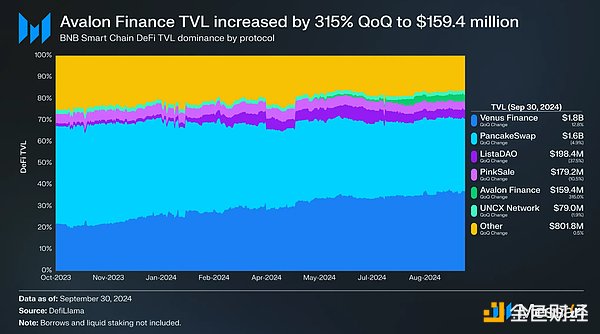 在第三季度,BNBSmartChain展現(xiàn)了穩(wěn)健的進(jìn)展,在DeFi、質(zhì)押和跨鏈計(jì)劃等方面都有重要發(fā)展。盡管BNB的市值略有下降(環(huán)比下降4%),但網(wǎng)絡(luò)活動(dòng)仍然保持強(qiáng)勁,日交易量達(dá)到340萬筆,雖然較第二季度略有下降。BNBChain的DeFiTVL環(huán)比增長2%至48.5億美元,鞏固了其作為TVL第四大鏈的地位。VenusFinance領(lǐng)先,TVL增長13%,而新加入的項(xiàng)目如AvalonFinance在加入BNBIncubationAlliance后也取得了顯著增長。liquidstaking解決方案和opBNBrollup的推出有助于推動(dòng)參與度和橋接TVB,提升了BNBChain的流動(dòng)性和用戶體驗(yàn)。