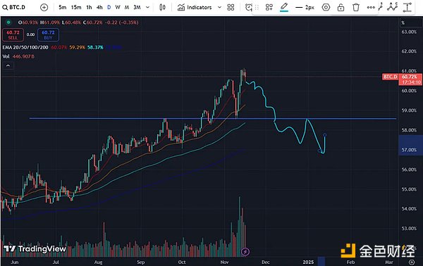 BTC.D代表BitcoinDominance(市場占有率)。這個指標對于預測我們在市場周期中的位置至關重要。這是因為它衡量了Bitcoin在整個加密市場中的份額。如果BTC.D為61%,那么Bitcoin在Crypto市場中控制著61%的份額。因此,61%的流動性專門用于Bitcoin。自然而然地,這意味著當前是Bitcoin的季節,我們應該預期山寨相對于Bitcoin會走弱。當BTC.D開始下降時,這對山寨是一個好跡象。這時候就是有趣的時候了,因為流動性更多地流向其他加密資產,比如Ethereum、藍籌股和山寨。