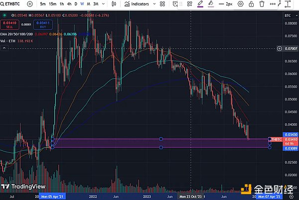 眾所周知,ETH是加密領域最大的生態系統,擁有最多的TVL(總鎖定價值)。TVL對于Blockchain來說就像存款對于銀行一樣重要。這就是為什么當它上漲時,一切都會迅速上漲,我們會看到到處都是綠色蠟燭。觀察高時間框圖表,你會發現ETH/BTC長時間走低。它現在面臨著約為0.031的強大支撐位,可以開始向上逆轉。這意味著可能觸發山寨季。ETH/BTC也可能在未能跌破0.033并收于0.04以上時逆轉。