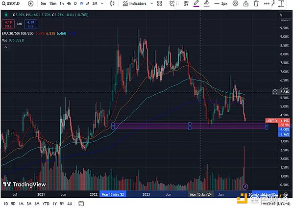USDT.D是加密市場中美元穩定幣USDT的占有率。泰達幣(Tether)發行USDT,我們知道它是加密領域最大的穩定幣。這意味著每當出現購買壓力時,人們會通過將USDT兌換為各種加密資產來購買。