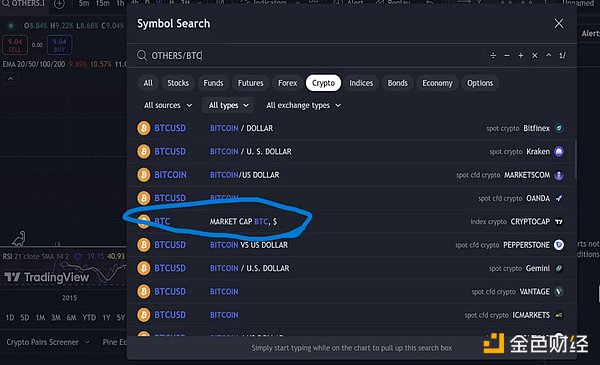 我們談論了OTHERS,即除了藍籌股之外的所有山寨。一個更好的圖表是查看這些山寨(OTHERS)相對于Bitcoin的表現。要在Tradingview上獲取這個圖表,只需打開搜索欄,輸入OTHERS/BTC,如圖片所示。然后查找標記的指標并點擊它。