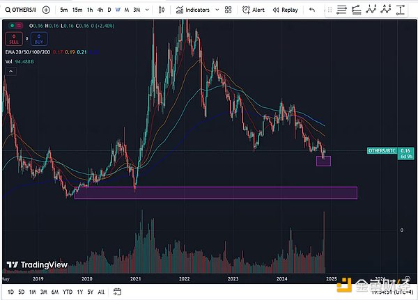 還有一個名為OTHERS的圖表,你可以在Tradingview上找到。這個圖表代表除了藍籌股和前十大項目之外的所有山寨。如果這個圖表上升而USDT.D下降,那就意味著簡單來說是2025年山寨季。