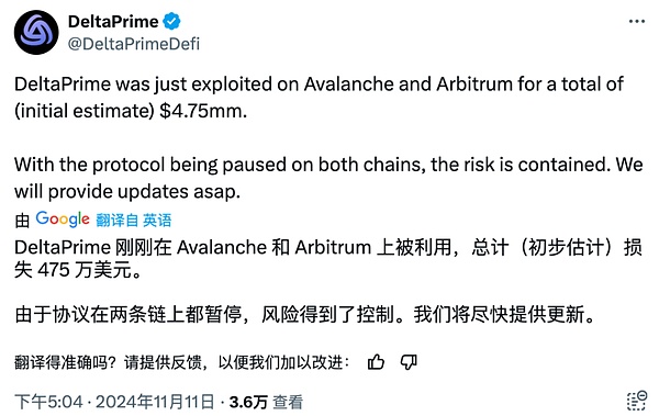 2024年11月15日,基于Aptos的DeFi項目Thala遭攻擊,導致2,550萬美元被盜,攻擊者利用了其智能合約中的漏洞。項目方暫停了相關智能合約并凍結了部分Tokens,最終成功凍結約1,150萬美元的資產。在與執法部門和多個Blockchain安全團隊合作后,項目方成功協商追回了資產,并允許攻擊者保留30萬美元作為賞金。