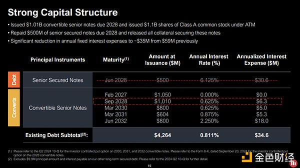 MicroStrategy籌集資金的主要方式是發行可轉換優先票據。截至2024年第三季度財務業績,該公司已通過此類票據累積了約42.6億美元的債務,平均年利率為0.811%,每年的利息支出為3460萬美元。