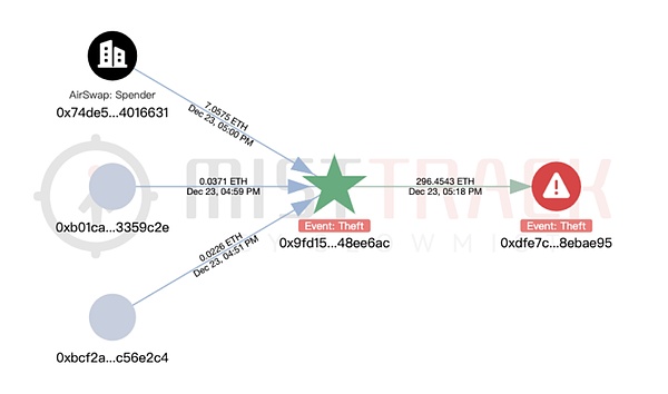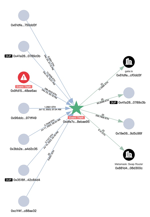 我們使用鏈上追蹤工具MistTrack分析受害者提供的黑客地址0x9fd15727f43ebffd0af6fecf6e01a810348ee6ac:黑客地址獲利超100萬美金,包括USD0++、MORPHO和ETH;其中,USD0++和MORPHO被兌換為296ETH。