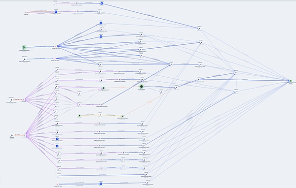 攻擊者利用閃電貸虛假推高$BOOTokens價值,借出其它加密資產。隨后,被盜資金被攻擊者轉換成FTMTokens,然后跨鏈到ETH鏈,將所有資金都存放在ETH鏈上。以下是ARB鏈和ETH鏈上的資金流動過程示意圖: