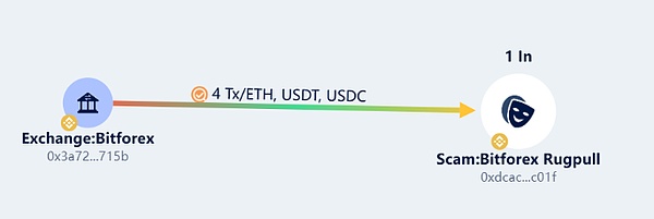Bitforex交易所在2024年2月24日6:11(UTC+8)開始陸續將40,771USDT、258,700USDC、148.01ETH和471,405TRB轉入Ethereum跑路地址(0xdcacd7eb6692b816b6957f8898c1c4b63d1fc01f)。