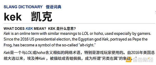 隨著互聯網文化的發展,這個詞在4chan和Reddit等平臺上衍生出新的用義。網友們發現在古埃及神話中存在一位名為「Kek」的神明,在希臘-羅馬時期被描繪為蛙頭人身的形象,且被視為混沌與黑暗的象征。這個巧合讓這個互聯網用語獲得了更深層的文化意涵。