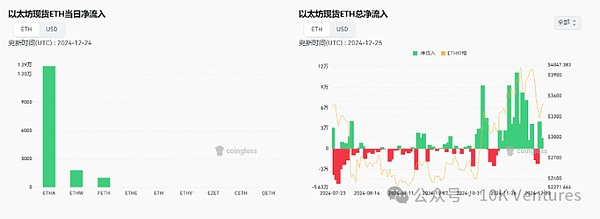 總的來說ETHETF的凈流入進展相對BTCETF較慢。在今年11月29日是分界點,ETHETF開始大幅凈流入,當天凈流入3億美金,是之前4個月累計凈流入的2倍。此后一段時間內,ETHETF開始持續凈流入,但我們也觀察到例如孫宇晨等cryptonative老OG開始拋售Ethereum,目前呈現的是圈內拋售,圈外ETF增持的趨勢。截止12月26日,ETF累計持有3%的ETH。