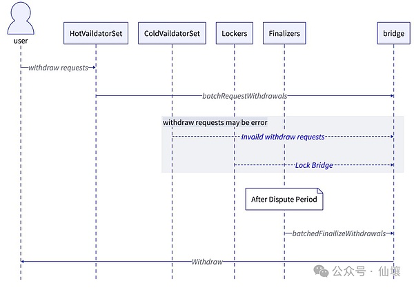 finalizers其實也是一組特殊的驗證者,主要用于確認跨鏈橋的狀態變化,從合約層面來看主要確認的就是用戶存款和提款。Hyperliquid的跨鏈橋使用“提交-確認”機制,比如用戶發起提款后并不會被立即執行,需要等待一段時間(這段時間被稱為爭議期)。等待爭議期結束后,finalizers內的成員執行提款交易,提款才可以被正常執行。