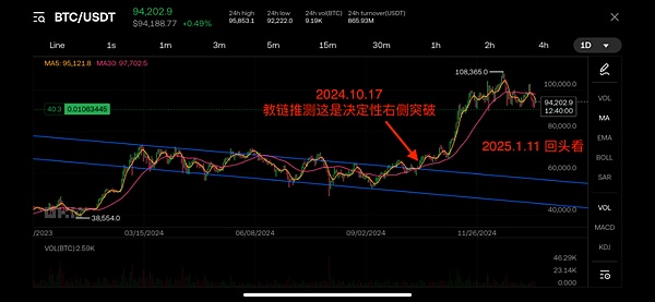 《大突破:BTC反冪律增長的另一種猜想》里的推測:「10月14號開啟的這根本周K線,很有機會成為今年初以來所構筑的下降通道的、向上的決定性突破。拉遠一些,視野放大,會看得更清楚。……目前,我們也許正處于本輪快牛周期啟動的前夜。只差臨門一腳。」