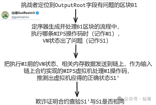 _stateData和_proof輸入這些MIPS虛擬機的環境參數,在鏈上運行單條MIPS指令,獲得權威結果。如果鏈上得出的權威結果與定序器提交的結果不一致,則說明定序器做惡。