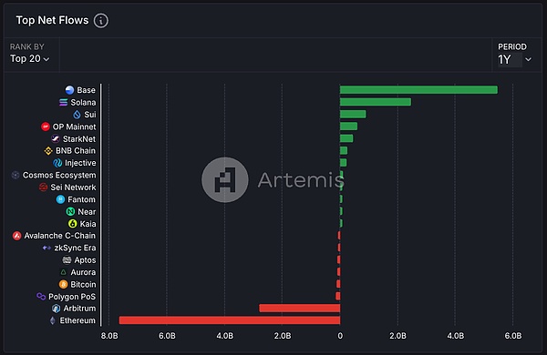 從一年來(lái)的資金流動(dòng)上看,Base、Solana、Sui等協(xié)議捕獲了大額流入,而Ethereum則流出將近80億美金。Ethereum生態(tài)的交易多集中在Base和Arbitrum上,雖然這符合以Rollup為中心的路線圖的預(yù)期,但L1的活動(dòng)低迷多少會(huì)影響到市場(chǎng)對(duì)ETH的定價(jià)。