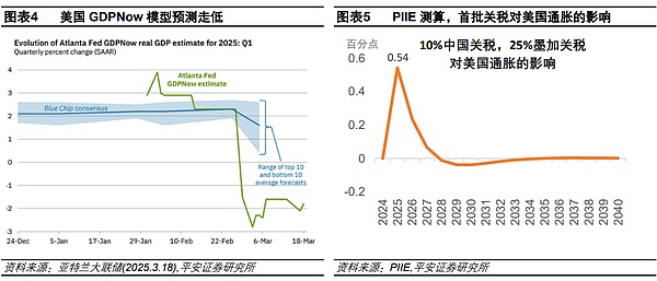對于通脹,我們也有理由擔心美聯儲的判斷過于樂觀。一方面,美聯儲可能并未充分計入關稅影響,至少沒有體現在最新預測上。2025年美國PCE和核心PCE通脹率僅被上修了0.2-0.3個百分點。而根據PIIE測算,10%中國和25%加、墨關稅的組合(不考慮反制),合計或抬升2025年美國通脹0.54個百分點,更不必說,目前對華關稅已提升至20%,且4月以后不排除對汽車、藥品、芯片、木材、農產品等產品加征關稅,以及貿易對手的反制還可能加劇通脹風險。另一方面,通脹預期上行的風險未能被重視。密歇根調查的1年和5年通脹預期,最新分別達到4.9%和3.9%,分別較2024年12月上行了2.1和0.9個百分點。由于短期通脹預期也會影響居民和企業行為,引發通脹的“自我實現”效應,鮑威爾所說的“通脹預期穩定”只看“長期通脹預測”可能并不完全科學。