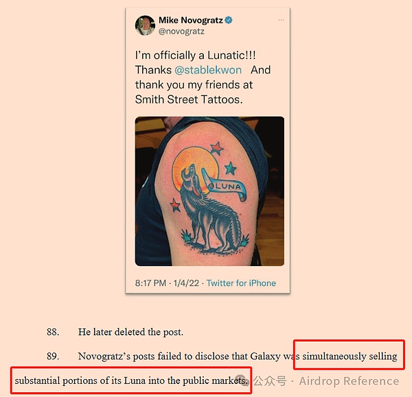 先講一個(gè)細(xì)節(jié),文件中詳細(xì)講述了MikeNovogratz,也就是Galaxy的CEO,如何用紋身來拉高Luna的。