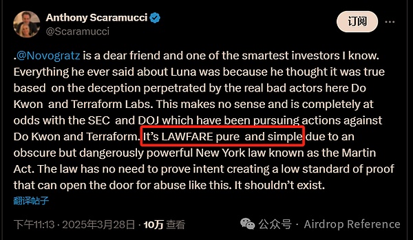 他說紐約州用一條過于寬泛的法律——馬丁法案(MartinAct),根本不需要證明被告的欺詐意圖,就能讓企業(yè)屈服付錢了事。言辭犀利,一針見血。這條推文一夜之間收獲了上千次轉(zhuǎn)發(fā)和點(diǎn)贊,迅速在加密社群發(fā)酵。
