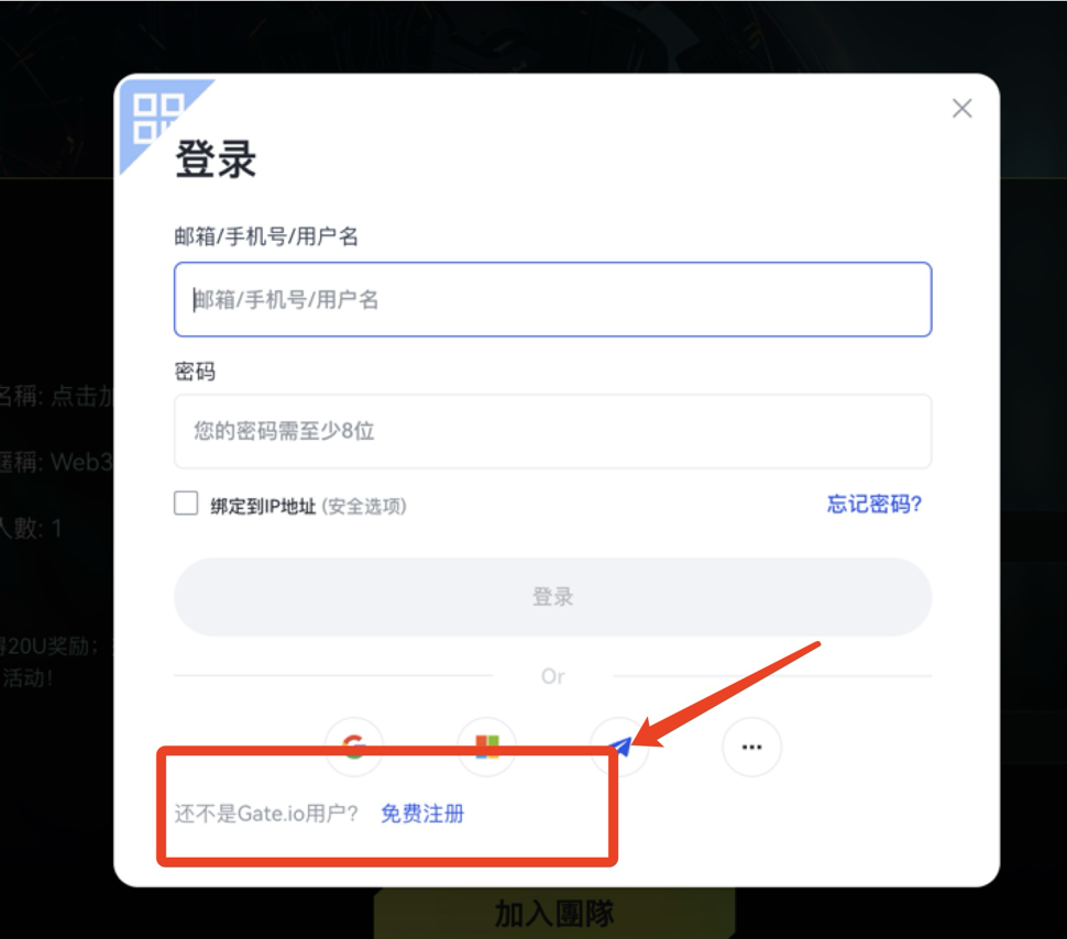 目前Gateio官網(wǎng)有兩個(gè)活動(dòng),點(diǎn)擊鏈接即可參與,打開頁(yè)面后點(diǎn)擊“加入團(tuán)隊(duì)”,在彈出框下面點(diǎn)擊“免費(fèi)注冊(cè)”