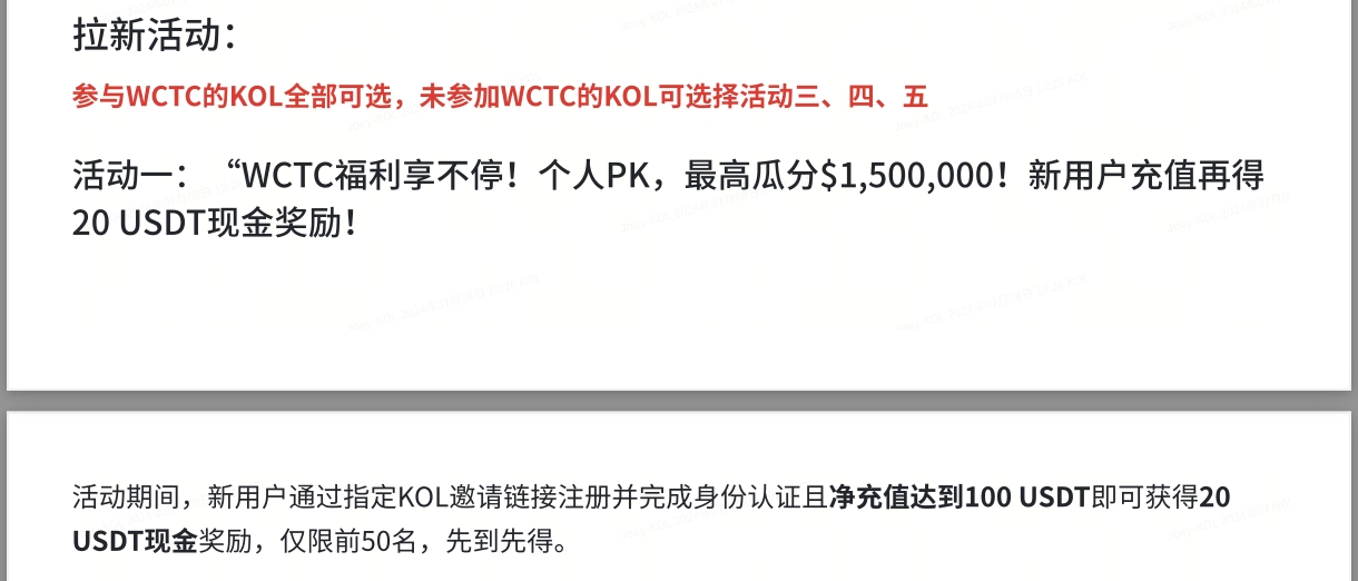 活動(dòng)一:“WCTC福利享不停!個(gè)人PK,最高瓜分$1,500,000!新用戶充值再得20 USDT現(xiàn)金獎(jiǎng)勵(lì)!
