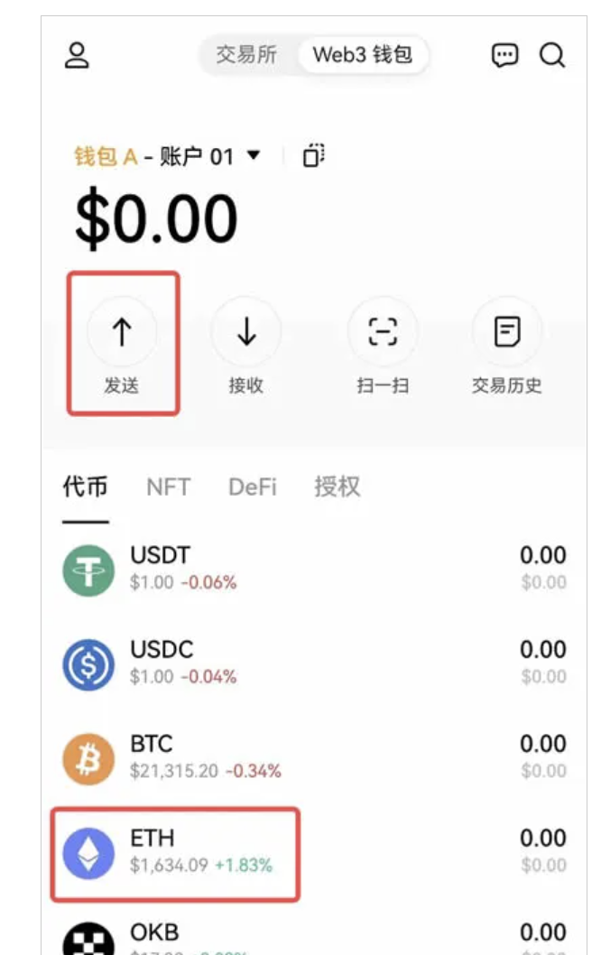 打開歐易Web3錢包,選擇要進行轉賬的錢包和賬戶,如錢包A-賬戶01,以ETH為例,點擊【發送】,選擇【ETH】。或直接點擊【ETH】進入詳情頁,再點擊【發送】,輸入【接收地址】、【交易數量】,以及選擇合適的【網絡費用】(默認平均,提供慢、平均、快、自定義4種模式),點擊【下一步】,確認即可。