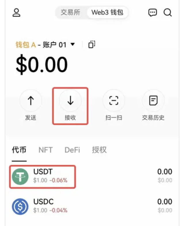 打開歐易Web3錢包,選擇要進行轉賬的錢包和賬戶,如錢包A-賬戶01,以USDT為例,點擊【接收】,選擇【USDT】。或直接點擊【USDT】進入詳情頁,選擇網絡,再點擊【接收】,復制收款地址或將收款二維碼分享給發幣方。