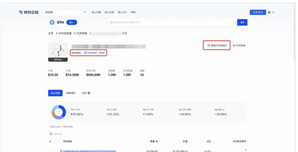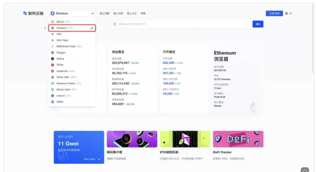 打開OKLink,切換至Ethereum瀏覽器,在搜索框內輸入Tokens名稱,并搜索。進入Tokens詳情頁。