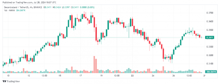 MANA用于購買Decentraland生態系統中的商品和服務,該生態系統在2021年底迎來了輝煌時期。當時,MANA的價格達到了超過5美元的歷史最高價(ATH),而目前的交易價格約為0.34美元。