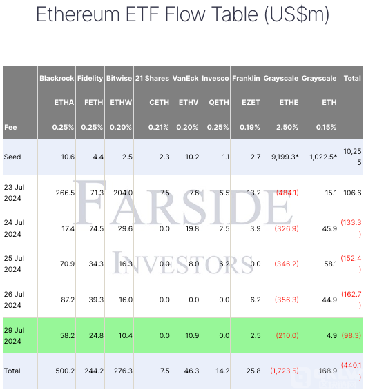 盡管ETHE面臨資金流出,其他幾只EthereumETF卻表現良好。貝萊德旗下的iShares Ethereum Trust(ETHA)獲得了5億美元的資金流入,BitwiseEthereumETF(ETHW)凈流入2.76億美元,富達Ethereum基金(FETH)則吸引了2.44億美元的資金。