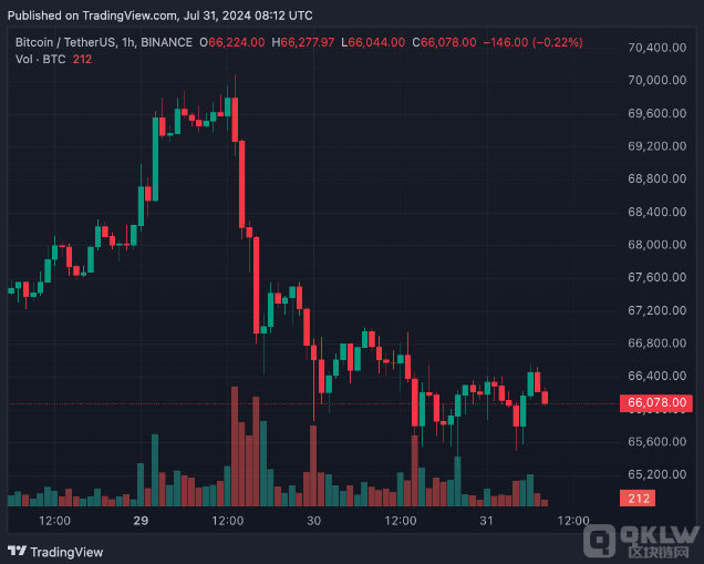 盡管日本央行的加息決定對Bitcoin等crypto市場的短期影響有限,但長期來看,貨幣政策寬松的趨勢可能會有利于Bitcoin等風險資產。今年迄今為止,Bitcoin價格上漲了56%,主要受到美國現貨ETF需求的推動。截至撰寫本文時,Bitcoin價格下跌1.2%,交易價格為66,078美元。