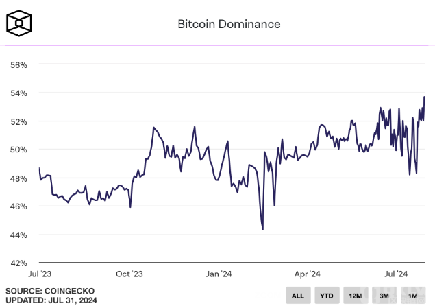 Bitcoin主導地位(BTC Dominance)是衡量Bitcoin市值相對于crypto總市值的指標。上周,Bitcoin主導地位達到52.7%,為2021年4月以來的三年高點。從6月22日星期一開始的一周內,BTC的主導地位從48.2%迅速上升至51.9%,并在本周繼續增加。