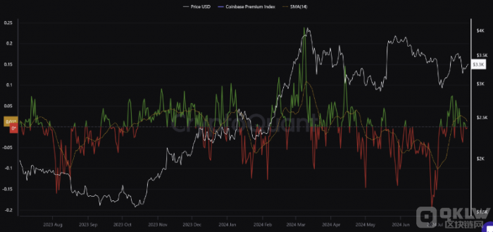 Coinbase的數(shù)據(jù)也顯示了市場對ETH需求的不足。ETH的Coinbase溢價指數(shù)在2024年第二季度持續(xù)下降。該指數(shù)在3月份達到峰值,與ETH的年度高點同時出現(xiàn),但目前已跌至負值。負溢價表明美國投資者缺乏購買壓力,現(xiàn)貨需求下降。