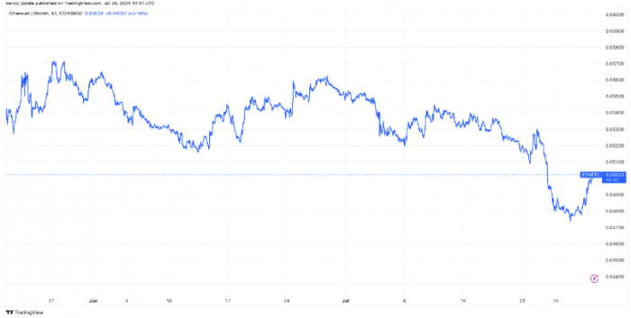 盡管過去三天ETH/BTC比率增加了5%,但從5月23日到7月30日期間,該比率下降了14%。