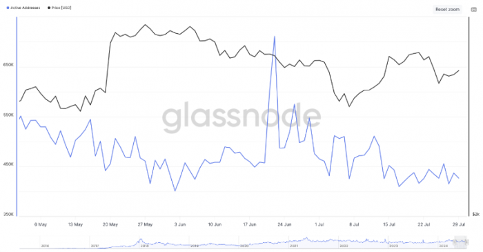 ETH下跌的原因眾多,其中包括2024年美國EthereumETF的資金流出。此外,Ethereum的網絡活動在過去一個月有所下降。Glassnode的數據顯示,Ethereum每日活躍地址(DAA)數量從6月22日的711,078個地址減少到7月10日的426,472個。