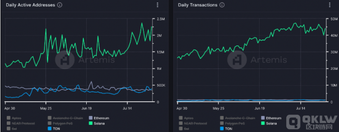雖然Ethereum仍然是第1層領域的主導網絡,但Solana最近在鏈上活動,總費用以及其他鏈上指標方面贏得了市場份額。Artemis數據顯示,Solana在每日活躍地址數和每日交易量方面占據了第一層細分市場的主導地位。自5月17日以來,開放網絡(TON)和Ethereum在DAA方面勢均力敵,當時TON首次超越Ethereum,并于6月初取得進展。