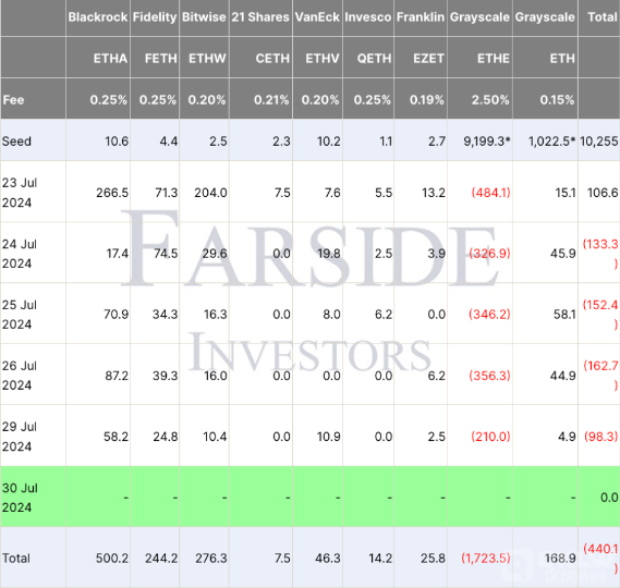新推出的現貨ETH ETF自7月23日開始交易以來,資金流入超過12.3億美元。這些資金流入被灰度Ethereum信托(ETHE)超過17.23億美元的流出所抵消。Farside Investors的數據顯示,目前EthereumETF現貨凈流出總額為4.4億美元。